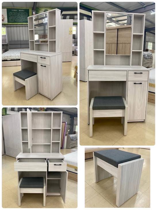 整組內容:5尺床頭箱+(813-02)5尺木心板床底箱+床頭櫃+鏡台(含椅)+三抽衣櫃+雙吊衣櫃+單吊衣櫃